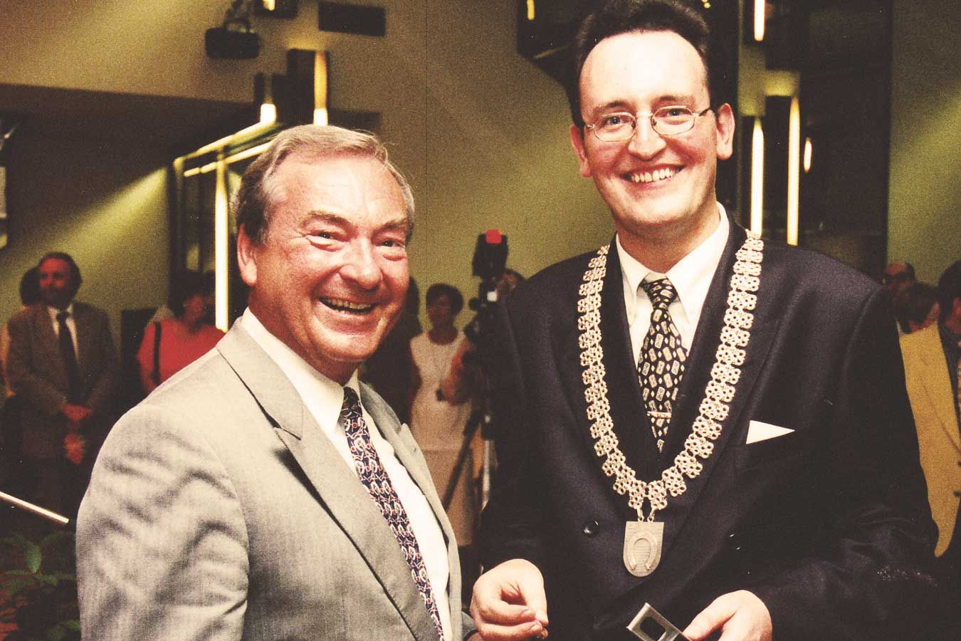 1998 wird Dr. Ralf Göck zum Bürgermeister der Gemeinde Brühl gewählt und nimmt die Gratulation seines Vorgängers Günther Reffert entgegen.