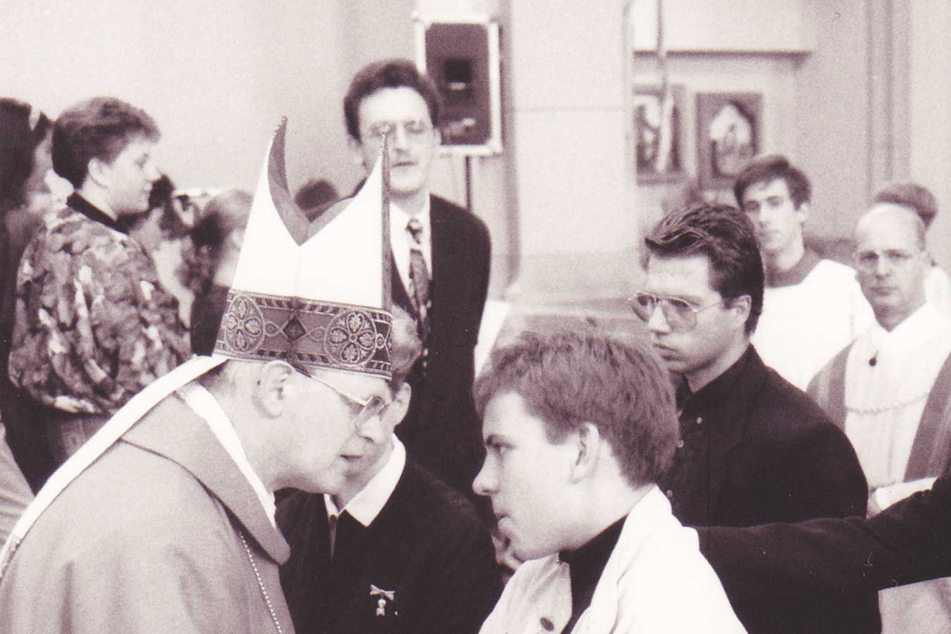 Seit seiner ersten heiligen Kommunion 1972 „diente“ Ralf Göck als Ministrant in der katholischen Kirche, später übernahm er Lektorats- und Firmhelferdienste, unser Bild entstand 1989, als Göck (im Hintergrund) seine Gruppe zur Firmung mit Weihbischof Gnädinger und Pfarrer Werner Florian an den Altar begleitete.